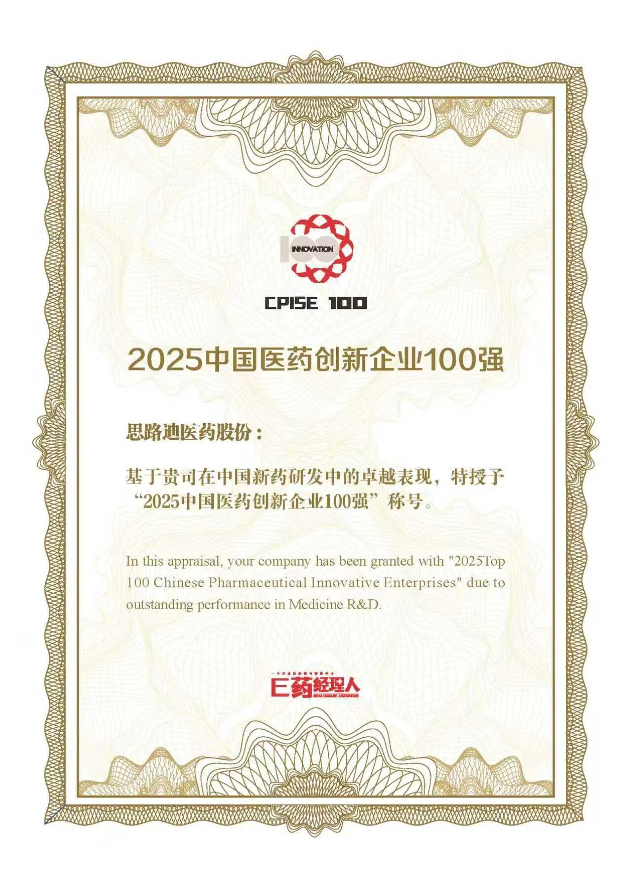 2025 年 11 月 24-26 日,第十七屆中國醫藥企業家科學家投資家大會暨海澱醫藥健康全產業鏈創新峰會(簡稱 “2025 啟思會”)在北京中關村盛大召開。本屆大會聚焦醫藥產業 “結構性拐點”,彙聚全球產業領軍者、頂尖科學家與資深投資家,共探行業高質量發展路徑。思路迪醫藥股份有限公司(股票代碼:1244.HK)憑藉在腫瘤創新藥領域的持續深耕、穩定的研發產出與卓越的商業化表現,連續第三年斬獲 “2025 中國醫藥創新企業 100 強” 榮譽, 彰顯了公司創新實力的持續性與行業標杆地位。
