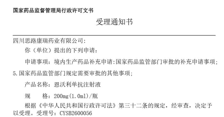 2026年2月,思路迪醫藥(1244.HK)宣佈,旗下商業化產品恩維達®(通用名:恩沃利單抗注射液)由附條件批准轉為常規批准的境內生產藥品補充申請,正式獲得國家藥品監督管理局(NMPA)受理,受理號為CYSB2600056,申請規格為200mg(1.0ml)/瓶。這是恩維達®上市後的關鍵里程碑,標誌著該產品的臨床有效性、安全性進一步確證。思路迪醫藥長期深耕差異化適應症和未滿足的臨床需求,佈局全球開發,I期在美國、日本和中國同步開展,是中國抗體藥物最早在FDA拿到I期臨床批件的biotech公司。